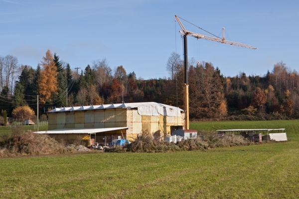 Unter einem großen Bauzelt bereits sichtbar: Das Gebäude aus der Gemeinde Jengen im Ostallgäu zeigt sich als zweigeschossiger Mittertennbau. Ursprünglich als Holzständerbau ausgeführt, umgibt die Wirtschaftsteile im Untergeschoss mittlerweile Ziegelmauerwerk, im Dachgeschoss sind verbretterte Holzkonstruktionen zu finden. 1670 errichtet, hat es bis zu seiner Translozierung zahlreiche Umbauten und Reparaturen erfahren. Es ist deshalb geplant, in den Räumen des Bauernhauses eine Ausstellung zu den unterschiedlichen Bauphasen des Gebäudes sowie zur Bauforschung zu präsentieren.